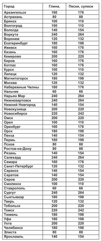 Нормативные глубины промерзания (по данным СНиП) в сантиметрах (с нагревательным саморегулируемым кабелем) для разных городов и типов.