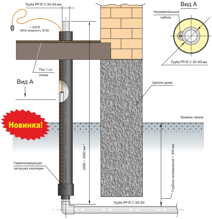 ТеплоВвод с обогревом устанавливается вертикально в зоне возможного промерзания трубопровода, с необходимым выпуском над полом 1-го этажа для дальнейшего монтажа разводки полипропиленовых труб по объекту и возможности подключения к сети электропитания 220В.