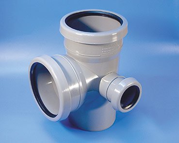 Такая крестовина позволяет соединять вместе 4 трубы под прямыми углами: 2 входящие трубы диаметром 110мм, 1 трубу 50мм и выходящую трубу 110мм.